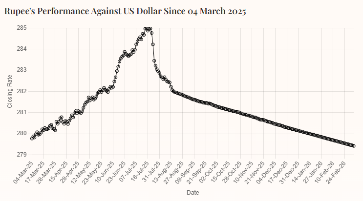 At the close of trading, the local currency settled at 279.41 against the greenback, strengthening by Re0.01.